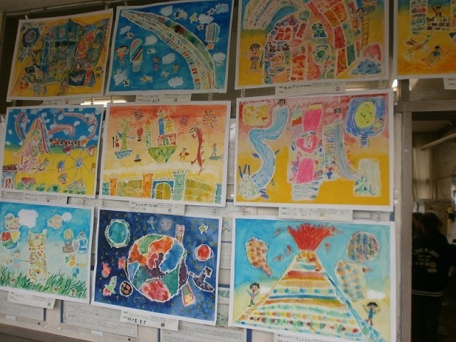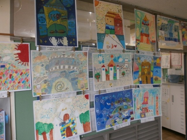 ひまわりやさまざまな場所の楽しそうな絵が飾られています。