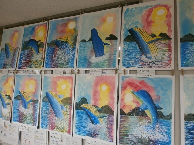 にじみをつかった色鮮やかな海の様子や人物が入った学校の様子をテーマに描きました。