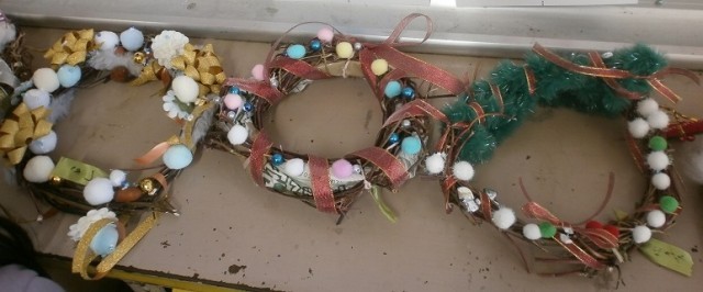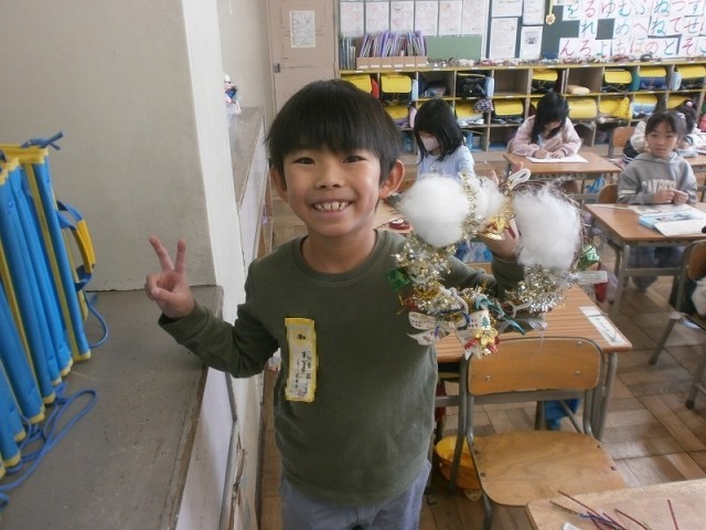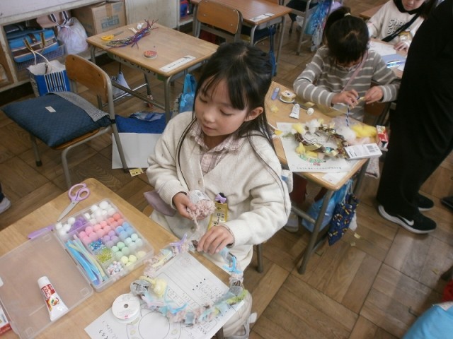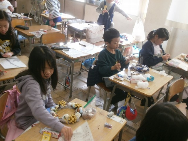家からいろいろな飾りをもってきていて,思い思いに自分の好きな飾りをリースにつけていました。