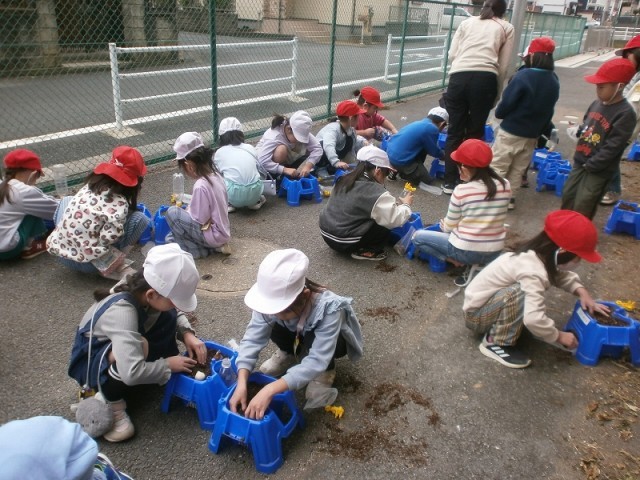 3校時にお買い物体験で購入した球根をさっそく植えていました。