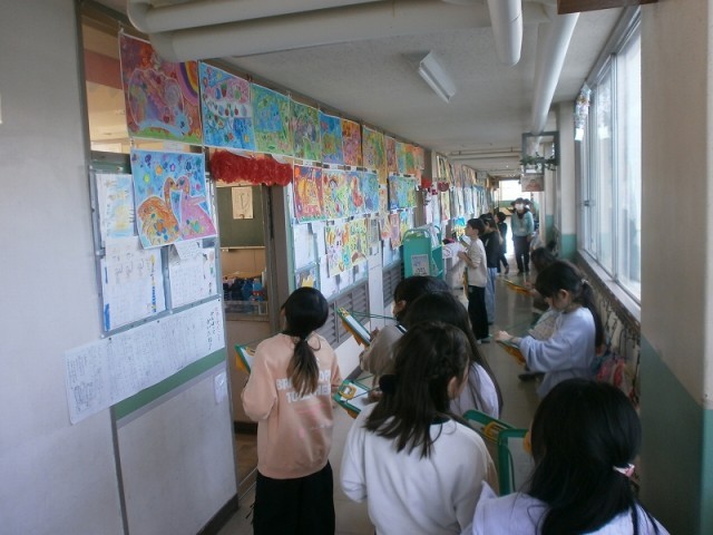 各学年の絵をまじまじと鑑賞し,よいところを探していました。