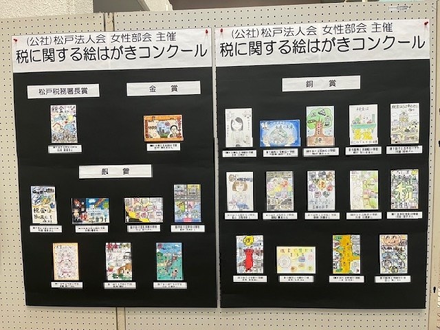 税に関する絵はがきコンクールの作品が現在,市役所に飾られています。