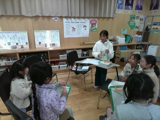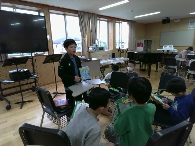 5年生から紹介された本をもとに,4年生がテーマを決めて2年生にブックトークを行いました。