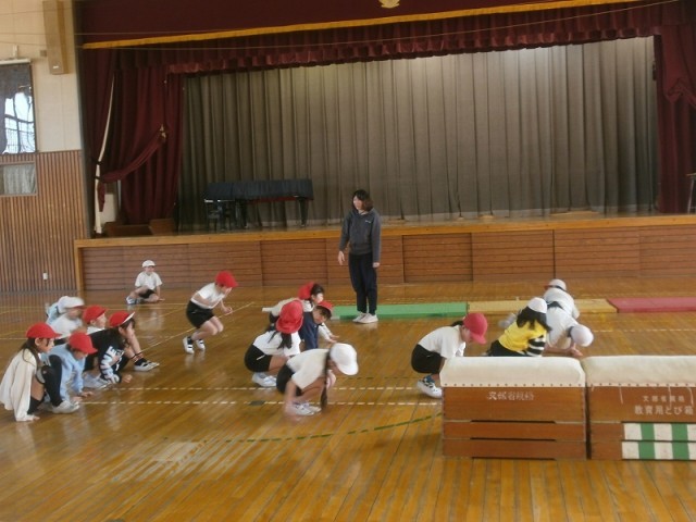 跳び箱を跳ぶことができるようにするための補助運動かえる跳びの動きを確認していました。