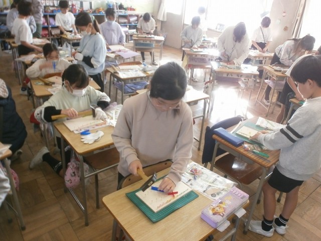 図工では,かなづちを使い,ビー玉が転がるコースを作っています。