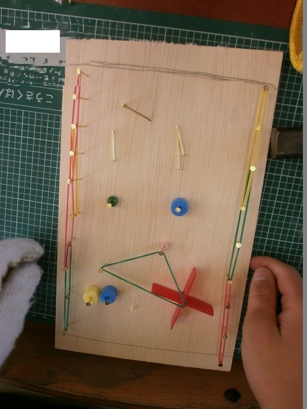 今年度は小さい板の教材を使用していて,友達の作品とくっつけてビー玉をころがせるようになるとのことです。