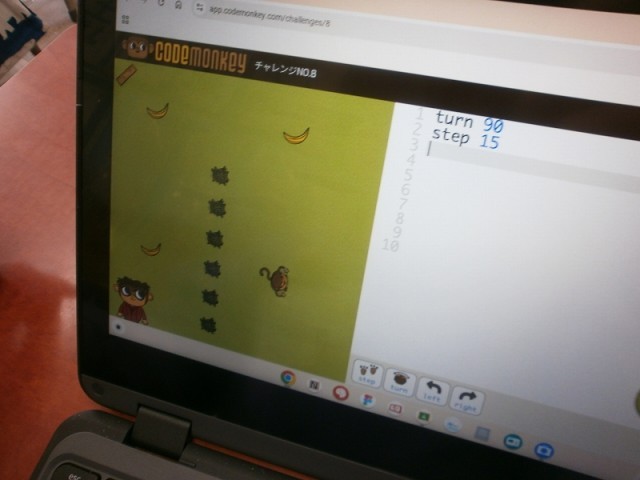 さるのキャラクターがバナナを取るためには、どう指示を出したらよいかをアプリで体験しました。