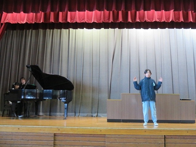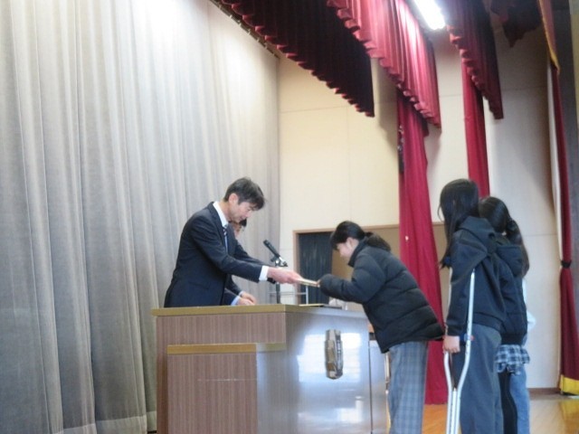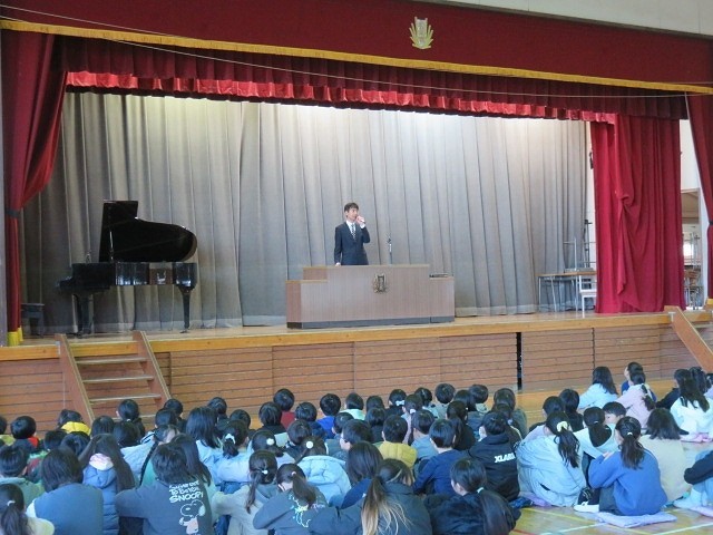 校長先生のお話。①夢や目標をもつこと ②なりたい自分をイメージし,行動すること ③あと12週間。今の学級の仲間との思い出を大切に ④交通安全 自分の身は自分で守ること などの話がありました。達成できるよう頑張りましょう。