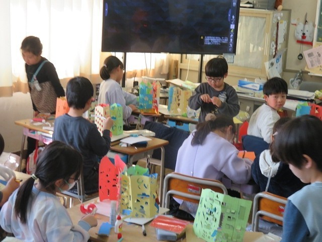 建物が建ち,建物のまわりの様子や窓からのぞいている生きものを作っていました。