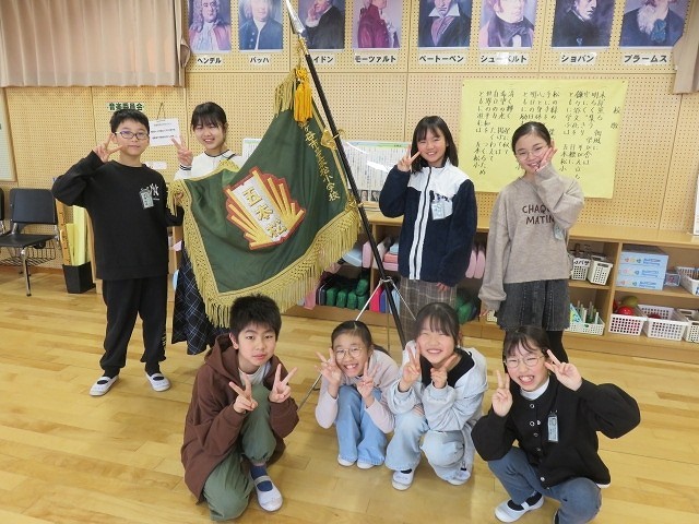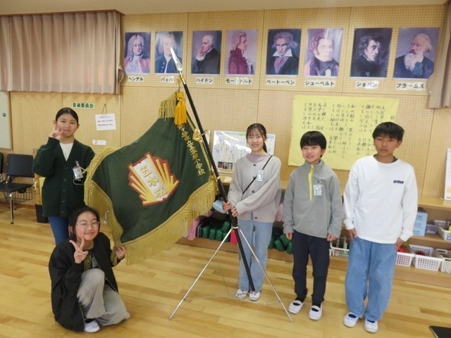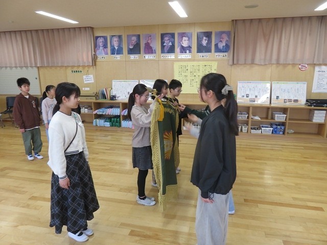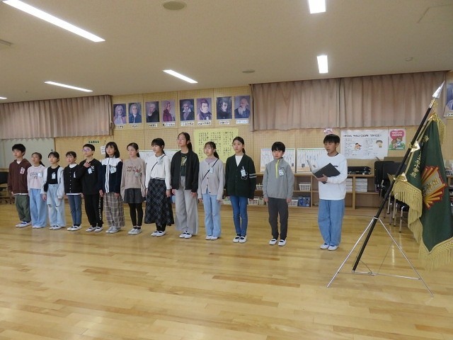 新旧児童会役員から一言ずつ挨拶があり,校旗の引継ぎをしました。