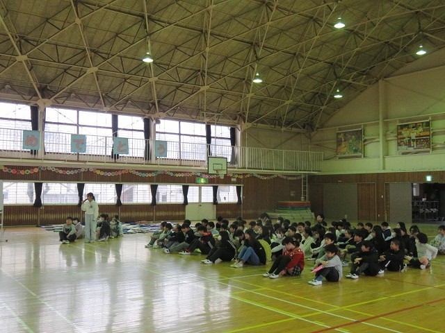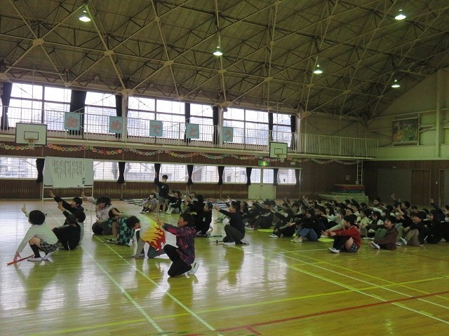 4年生が6年生を送る会に向けて体育館で発表の練習をしていました。