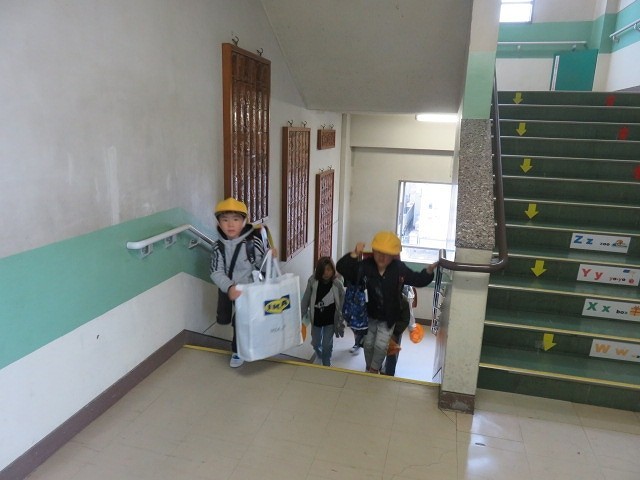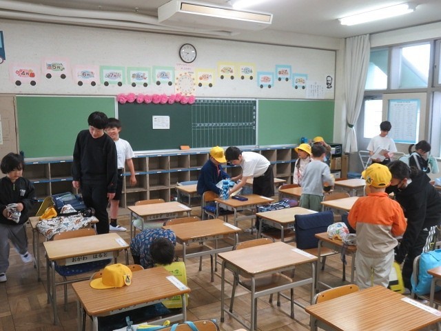 6年生は優しく1年生に声をかけ,教室まで案内したり,ランドセルや荷物のしまい方を教えたりしていました。