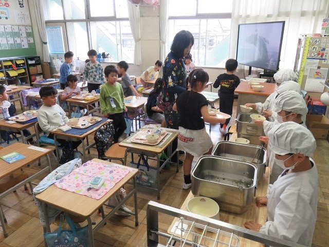給食の配膳は落ち着いて取り組むことができ,熱いスープを盛るのもとても上手でした。