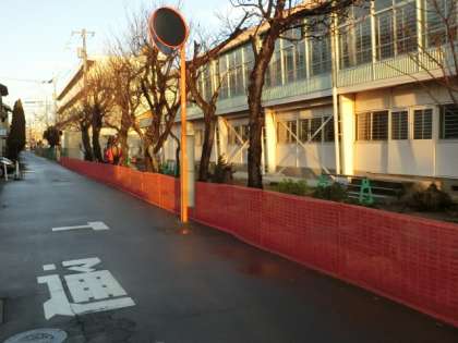 増築工事に伴い、セットバックを行います。校地南側道路を広げるため、フェンスを現状より1mほど北側に作り直します。体育館側のフェンスはすでに写真のとおり仮のもの(オレンジ色)になっています。子どもたちが通る昇降口から正門側も工事が始まる予定です。安全第一で工事は進めていますが、子どもたちにも気を付けるように声かけをお願いいたします。