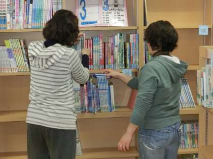 昨日の図書室引越作業に続き、今日は蔵書点検を図書ボランティアの方々が行ってくれています。