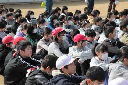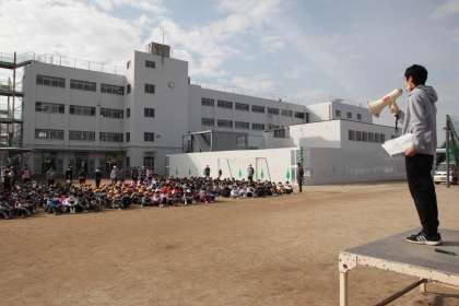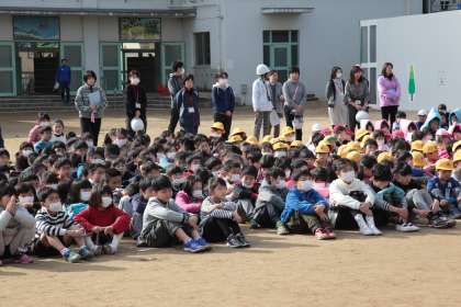 その後、安全主任より1995年1月17日に起きた、阪神淡路大震災での話を聞きました。発生した時間が5時46分であり、いつ地震は起きるかわからないこと。自分の身は自分で守ること。児童は真剣に耳を傾けていました。集合するまで おかしも の約束をしっかり守ることができた避難訓練でした。