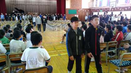 今日は午前中に5、6年生の卒業式練習が行われました。退場練習の写真です。間隔をとりつつ、目線は下げずないことを守り、堂々と行進しています。