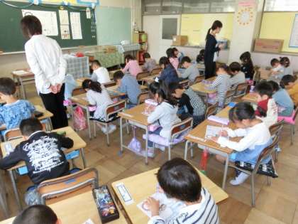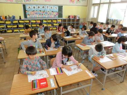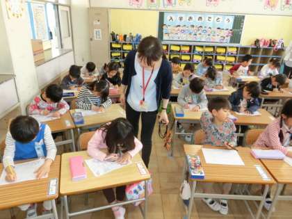 1年2組も、1組と同じように、正しい姿勢、鉛筆の持ち方について学びました。