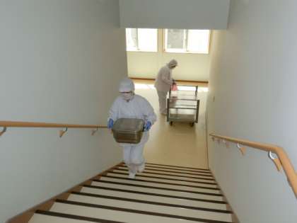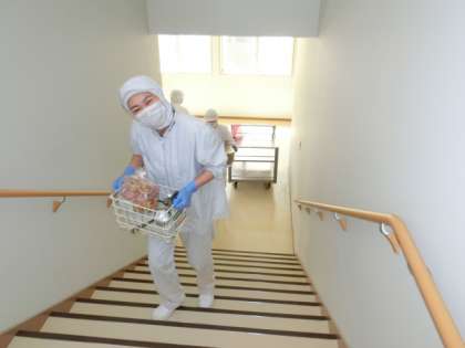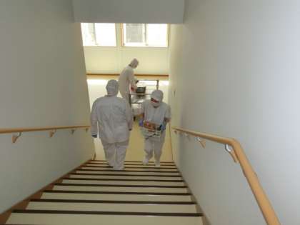 今年度から使用を開始した増築普通教室棟。1階に6年2、3組が、2階に6年1組があります。この新校舎には、給食用エレベータがありません。このため、2階の6年1組分の給食は、配膳員さんが文字通り手で運んでいます。ありがとうございます。