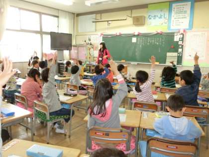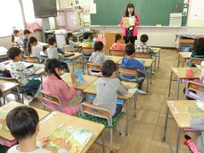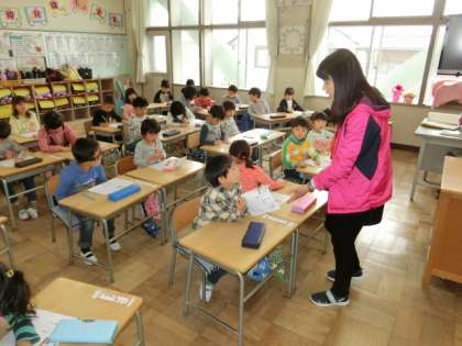教科書を開いて、何があるか発表していました。みんな元気に手を挙げて発表していました。その次にひらがなの練習をしました。「し」の練習です。上手に書けたかな?
