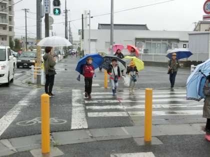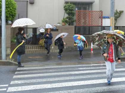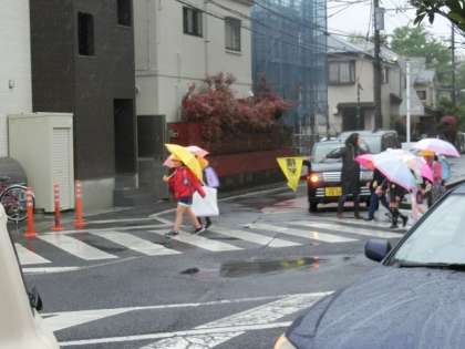 雨が降ると、送りで駅へ向かう車の交通量も増えます。また、傘を差して自転車に乗っている人もいます。五小っ子たちも傘を差しての登校となるので、歩道いっぱいに広がりがちです。お互いに気持ちよく道路を使えるように気を付けていたいと思います。