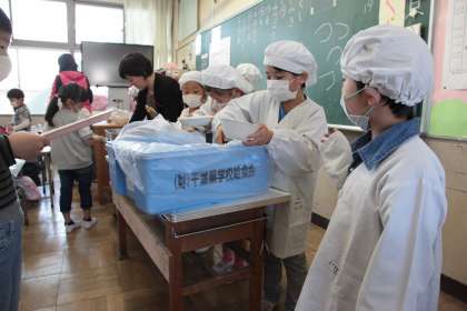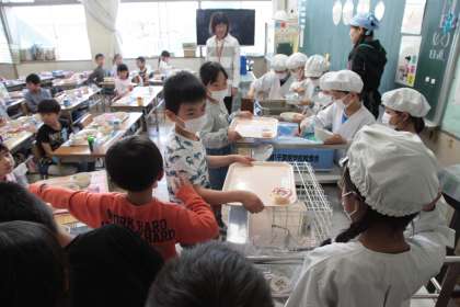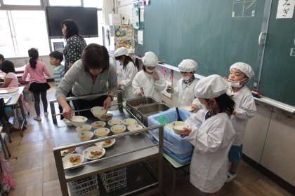 はじめてづくしの1年生ですが、今日から給食が始まりました。ごはんを盛るのが大変で、時々手についてしまったご飯粒を口の中にぱくっと 食べていました。