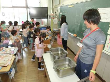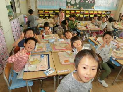 昨日は、配膳の様子を紹介したので、今日は給食の終わり頃の様子を紹介します。