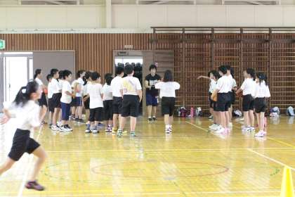 体育館ではミニバスケット部の指導が行われていました。風も入り涼しい朝でした。