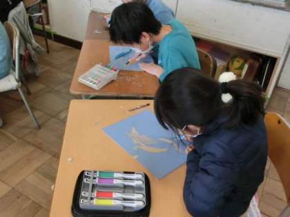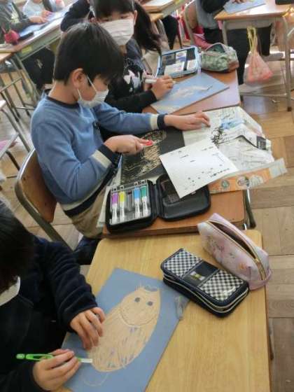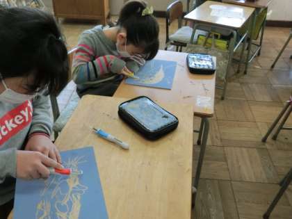 先日の彫刻刀教室の続きで、4の4が版画を彫っていました。