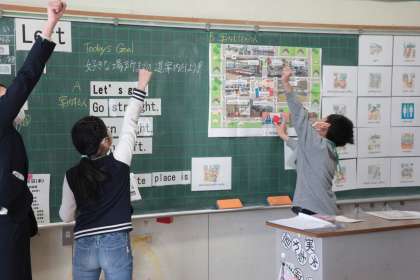 4年3組はThis is my favorite place ということで、自分の好きな場所を説明するのですが、そこまでの道のりを go straiget turn right と、道を英語で説明しながら発表しています。