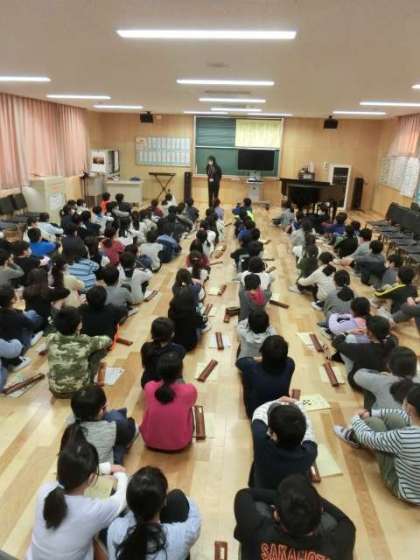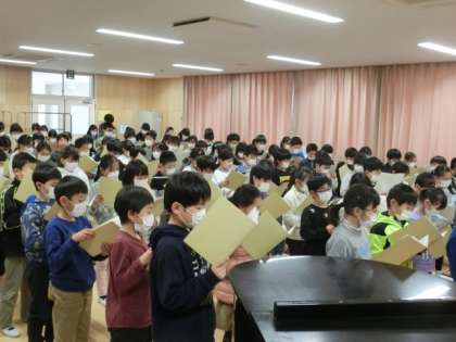 4年生が音楽室に集合して、2分の1成人式に向けて初めての学年練習に取り組んでいました。呼びかけの声も、学年がそろうと素晴らしい大きさです。