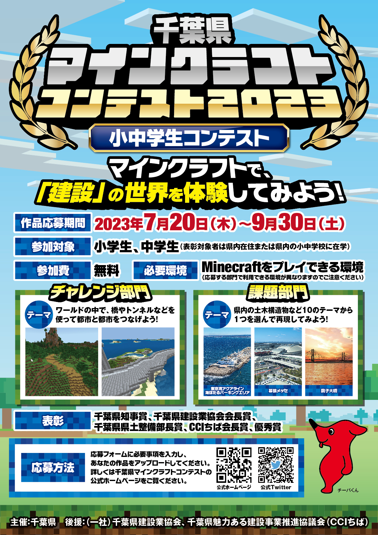 千葉県マインクラフトコンテスト2023(小中学生コンテスト)について 公開日 2023/07/10 更新日 2023/07/10 お知らせ 鎌ケ谷市教育委員会より「千葉県マインクラフトコンテスト2023(小中学生コンテスト)」についてお知らせがありましたので、ご覧ください。 マインクラフト募集案内 いいね(0)