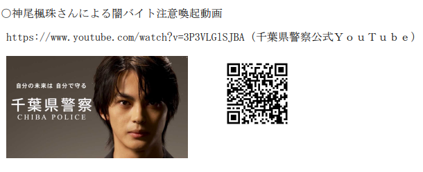 この度、千葉県警察少年課において、俳優の神尾楓珠さんによる注意喚起動画を制作しました。少年達の未来を守りたいという思いで制作しております。ぜひご家族やご友人と一緒にご覧いただき、神尾さんのメッセージを「闇バイト」に対する心構えとしていただけたらと願っております。