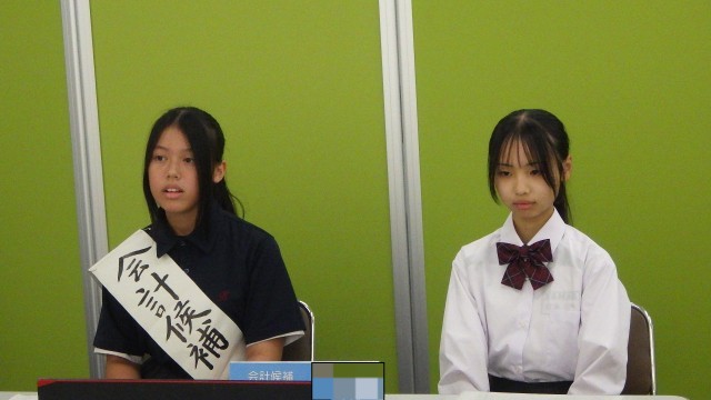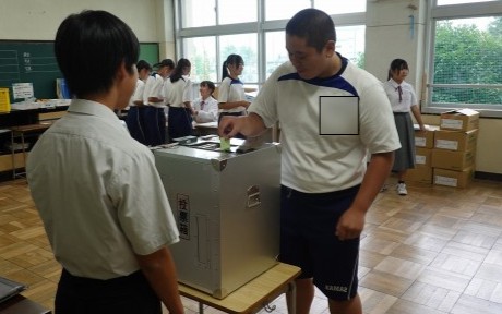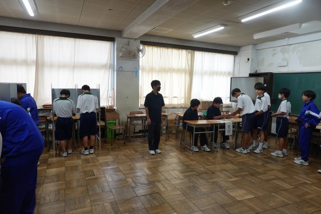 ポスター掲示、朝の選挙運動、帰りの会でのクラス訪問演説等の数週間の選挙活動を経て、本日の生徒会役員選挙を迎えました。例年なら体育館で行いますが、10月より体育館の空調工事のため、リモート配信で実施しました。立候補者はもちろん、応援演説者もすばらしい発表を各クラスに届けてくれました。その後投票となり、鎌ケ谷市より拝借した実際の選挙で使用する投票箱や記載台に真剣に投票する生徒の姿が見られました。結果はすべて信任され新しい生徒会役員が決定しました。これからの頑張りに期待しています。まら、これまでも今日もスムーズな進行に全力を尽くした選挙管理委員のみなさん、ありがとうございました。