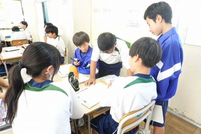 たり、交流したりして、目的に迫る場です。学校が存在する意義はここにあるといって良いと思います。授業でも、みんなで知恵をしぼったり、自分では気づかなかったことを他から教えられ、新しい発想が生まれることがあります。今は「協働的な学び」といいますが、今までも学校で大切にしていた学び方です。今日は、そんな場面を追ってみました。