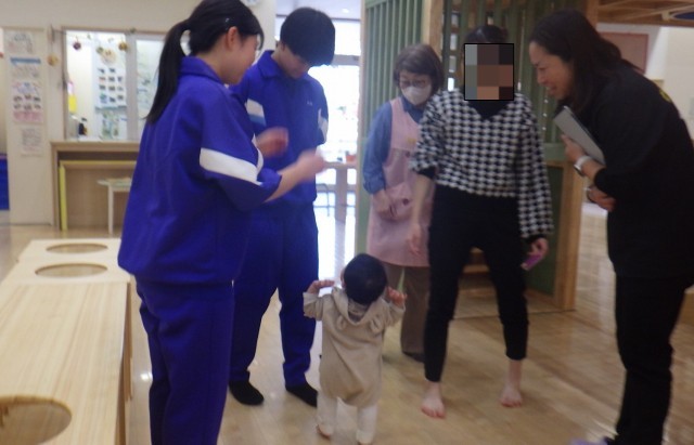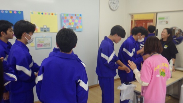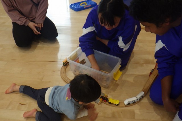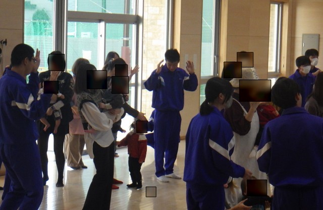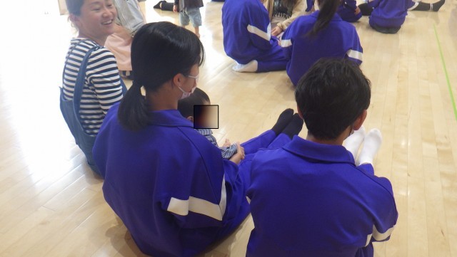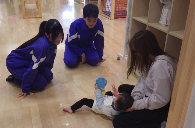 3学年を対象として、家庭科の時間に「保育体験」を行いました。本校の裏にある東部児童センターの職員の方々にご協力を得て実施しています。幼児との関わりを通して、幼児への理解を深める学びと、生徒の豊かな心の醸成に繋げていく授業です。生徒は体験前に消毒をしたりといつもとは違った緊張感に包まれながら、参加していました。授業の終わりくらいになりやっと笑顔が出てきました。今日からスタートし、3年生のすべてのクラスで実施する予定です。このような貴重な体験をさせていただきました、乳幼児とその保護者の方々にも感謝いたします。ありがとうございました。