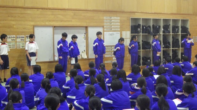 職員から、遅刻や欠席時の連絡手段、帰着後の連絡手段など、細かなことが伝えられた後、各学級の実行委員から明日明後日の意気込みと、大事にしたい心構えについて話がありました。「報連相を大事にする」や「困った時は事業所の方に相談する」「この取り組みが事後の活動に活かせるようにする」など、立派な姿勢で学年の前で発表しました。この事業の取組を経て、また一段階大人に成長したように感じます。明日からの2日間を経て、さらにどのような成長をして帰ってくるのか、非常に楽しみになりました。