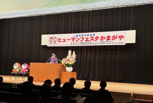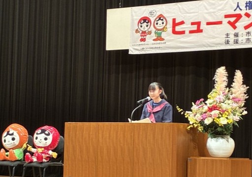 鎌ケ谷市きらりホールにて、ハートフルヒューマンフェスタかまがやが開催されました。人権週間事業として毎年実施され、その第1部として、市内中学生による人権作文の朗読が行われました。本校の代表生徒は、点字ブロック等を調べ、視覚障害者との関わりかたについて、「それも一つの個性だから」というタイトルで発表しました。「誰もが過ごしやすい社会にしていくために、障害者についていもっと深く知り、支えていくことが大切だと思います。傷害者もひとつの個性として接していくことができれば、多様性を尊重する社会を気づいていけると考えました。」とまとめ、会場は大きな拍手に包まれました。