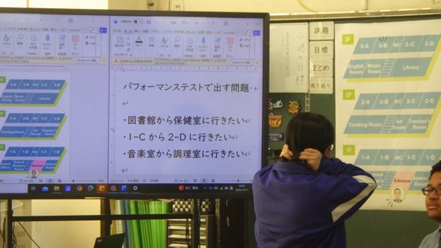 英語はALTの先生の授業でした。パフォーマンステストに向けて、お互いに練習をしていました。