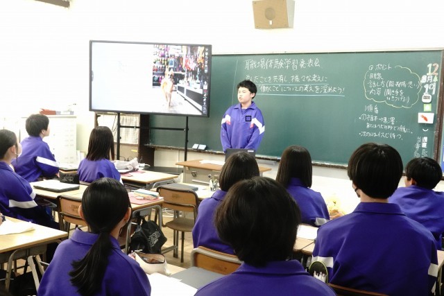 本日、2学期末授業参観及び、学級懇談会を行い、多数の保護者の皆様にご来校いただきました。今回は各学年、総合的な学習の時間の取組をご覧いただきました。3年生は「卒業に向けて」、2年生は「職場体験の報告」、1年生は「校外学習の報告」とそれぞれ学年テーマを決めて、学級ごとに行いました。2年生と1年生の発表は明日の学年集会の時に、各クラスの評価が高かった発表を全体の前でしてもらう予定です。