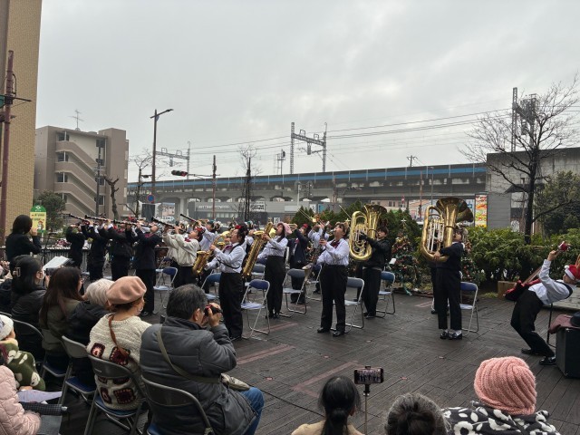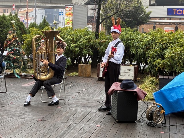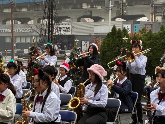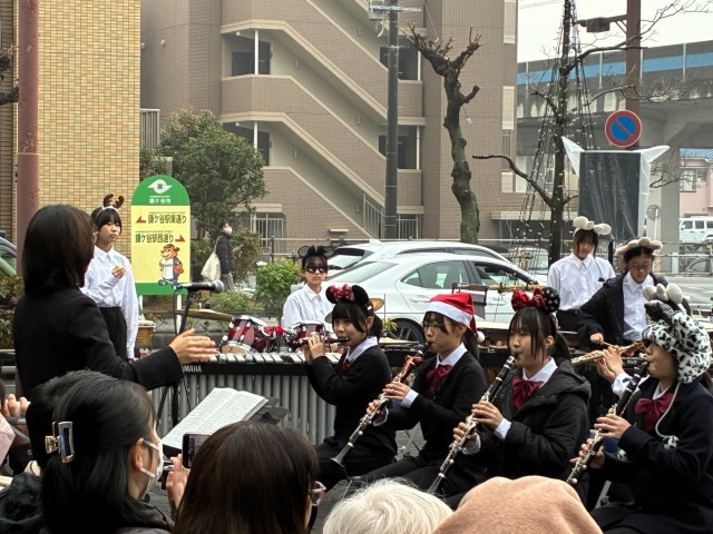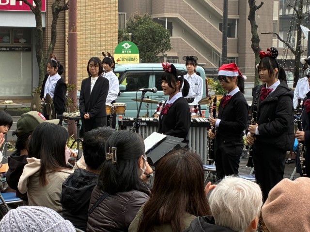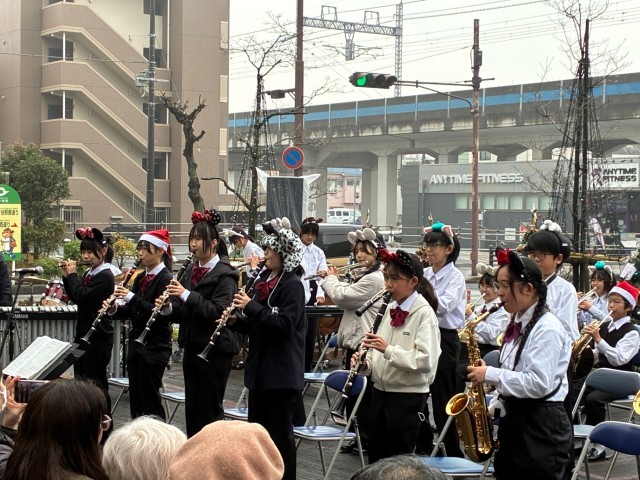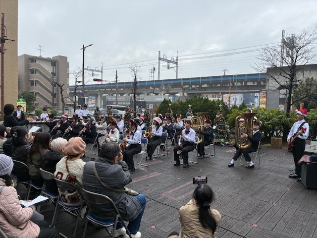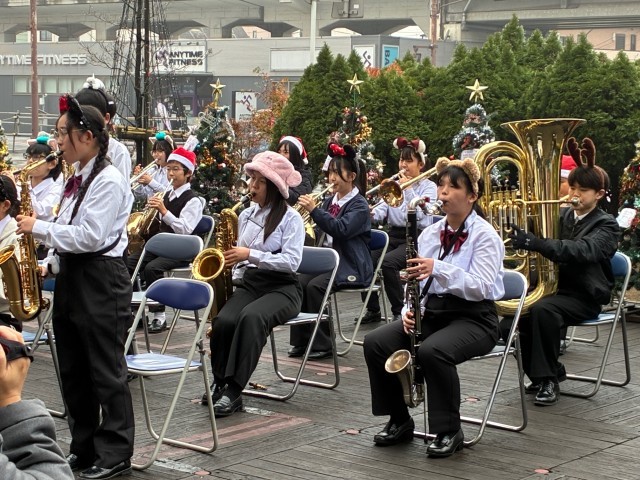 本日、「クリスマス in かまがや ~ 音と光とこどもたち」のイベントが鎌ケ谷駅で行われ、本校吹奏楽部も参加し演奏してきました。例年恒例のイベントで市内5校、鎌ケ谷高校、地域の演奏楽団などが参加します。本校の吹奏楽部もクリスマスらしい飾りを身につけ、クリスマス曲を中心に演奏しました。雨も収まり、風もない状況で落ち着いて演奏でき、しっかりと練習の成果をお届けすることができました。ご鑑賞いただいた皆様、ありがとうございました。