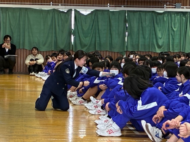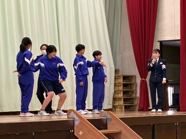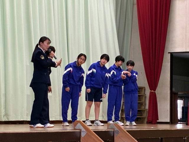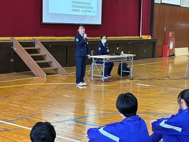 本当に久しぶりに全校生徒が体育館に集合しました。今日は、千葉県警察本部の「よくし隊 あおぼーし」の方に来てもらいました。防犯についての講話をしていただき、SNSで犯罪に巻き込まれた例をいくつも挙げたり、「闇バイト」「痴漢」等についてもきつく注意喚起をしていただきました。親しみのある話し方で笑いもありましたが、終始生徒は真剣に話を聞いていました。最後に代表生徒がステージに上がり、簡単な護身術を教えていただきました。今後はさらに防犯に対して意識を高く持って生活していきたいと思います。本日はありがとうございました。