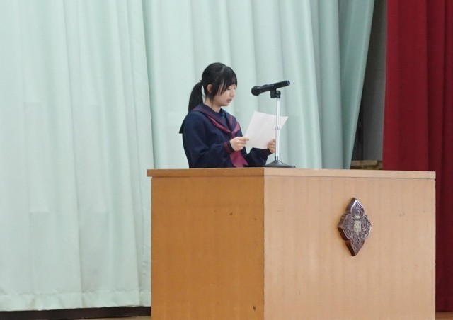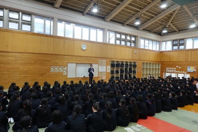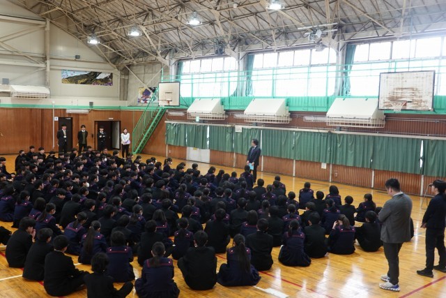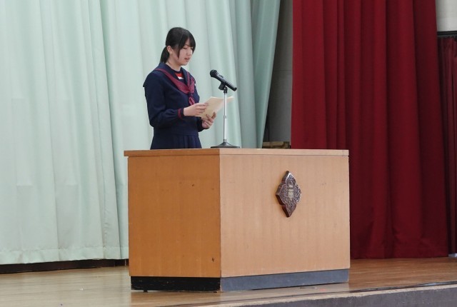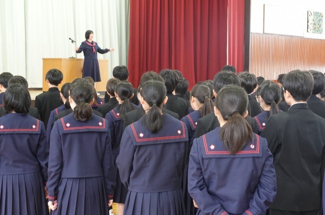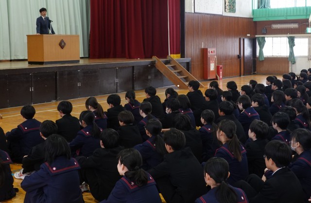 久しぶりの校歌が体育館に響き、代表生徒の決意発表には、すべての生徒が顔をあげ真剣に聞く姿が見られました。校長の話では学校教育目標「心豊かで、たくましく、しなやかに生きる生徒の育成」を取り上げ、「たくましさ」と「しなやかさ」の両面で成長していってほしいことを伝えました。