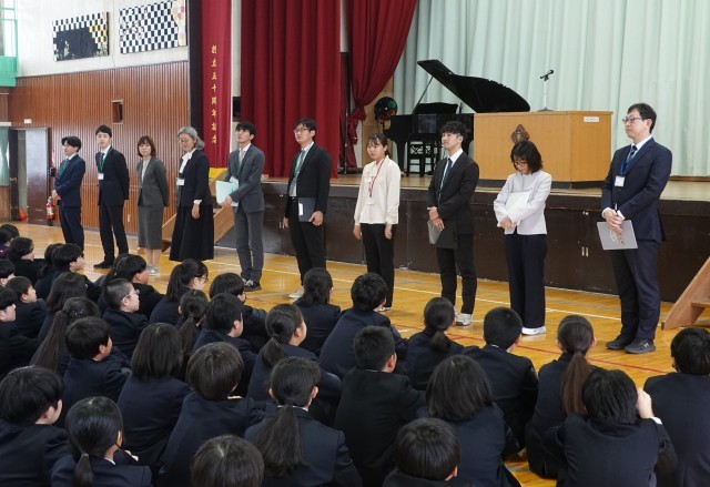 その後の職員紹介の様子ですが、1年生の先生方の紹介は、明日の入学式・HPで紹介します。また、その後は学年ごとに分かれて、クラス発表を行いました。各学年ともとても時間を掛けてクラス編成を行っていました。今日お子さんが帰宅したら、ぜひ感想を聞いてみてください。