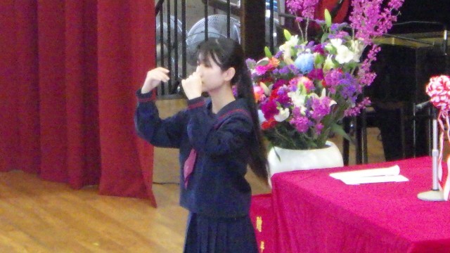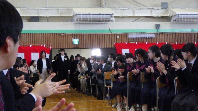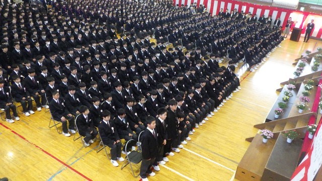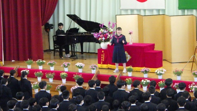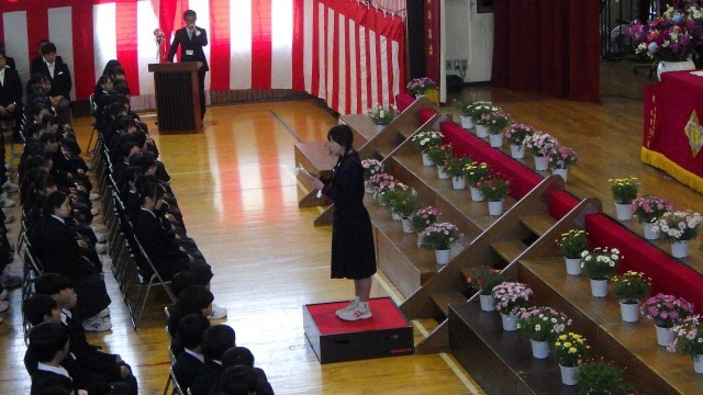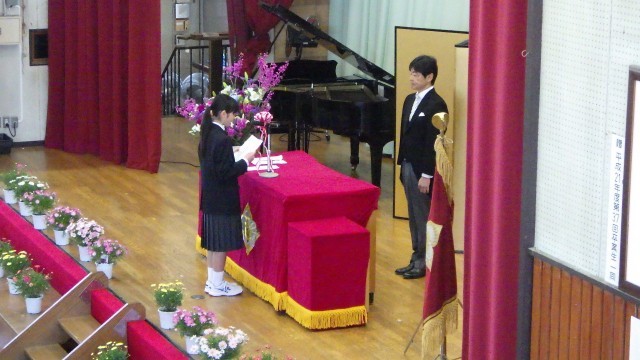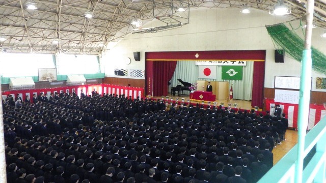 雲一つ無い快晴の中、第55回入学式当日を迎えることができました。新入生のみなさん、保護者の皆様、ご入学おめでとうございます。入場から新入生呼名までとても緊張しながらも一生懸命に取り組む姿を見て、大変嬉しくなりました。また2、3年生の落ち着いた態度がよけいに目立ち、成長したお兄さんお姉さんぶりにも改めて感心しました。歓迎の言葉、また合唱の指揮・伴奏者、そして新入生誓いの言葉の代表生徒はこれだけ多くの聴衆が見守る中、さすがと感心するパフォーマンスでした。PTA会長の祝辞も温かみがあり、新入生も真剣に話しに聞き入っていました。