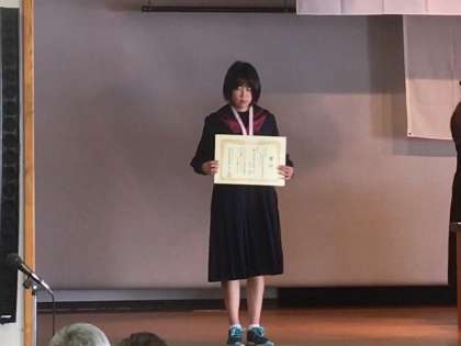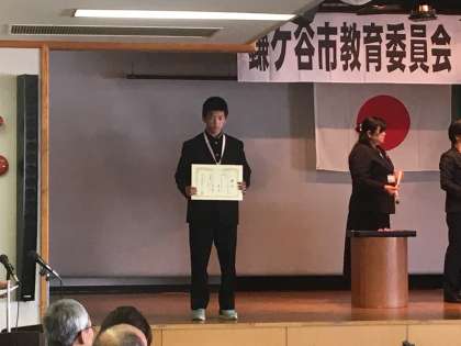 鎌ケ谷市小中学校児童生徒表彰式の様子です。写真上から、陸上の杉山さん、柔道の後藤君、アーチェリーの稲生さんです。