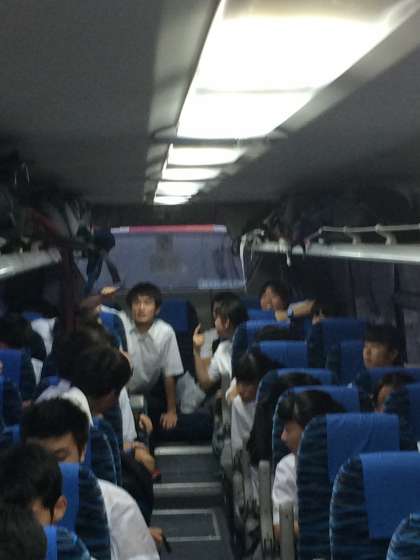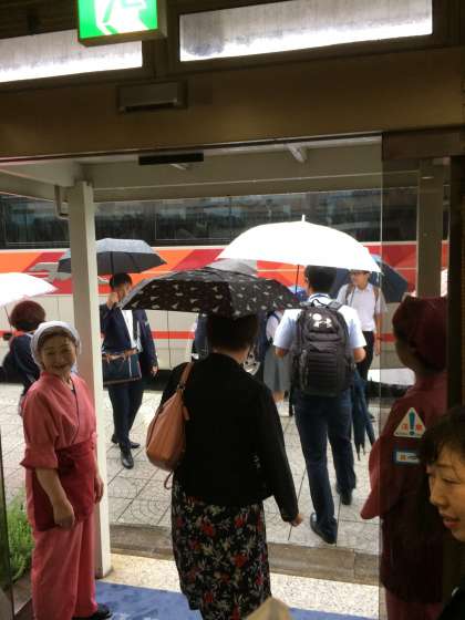 ホテルロビー前にバスをつけてもらいました。三十三間堂に向けて出発しました。二キロ弱で着きます。