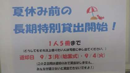 図書室で夏休み用の本の貸し出しが始まっています。この夏、たくさん本を読んで自分自身の幅を広げましょう!