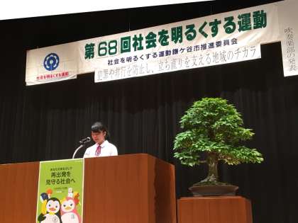 社会を明るくする運動、3年生金子さんの表彰および作文発表の様子です。すばらしい発表でした。おめでとうございます。