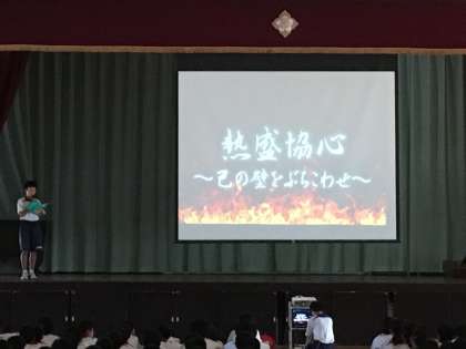 6時間目は体育祭に向けたブロック集合がありました。はじめに、体育主任から心構えに関するお話があり、その後生徒会長、木村くんから今年のスローガン「熱盛協心〜己の壁をぶちこわせ〜」の発表がありました。
